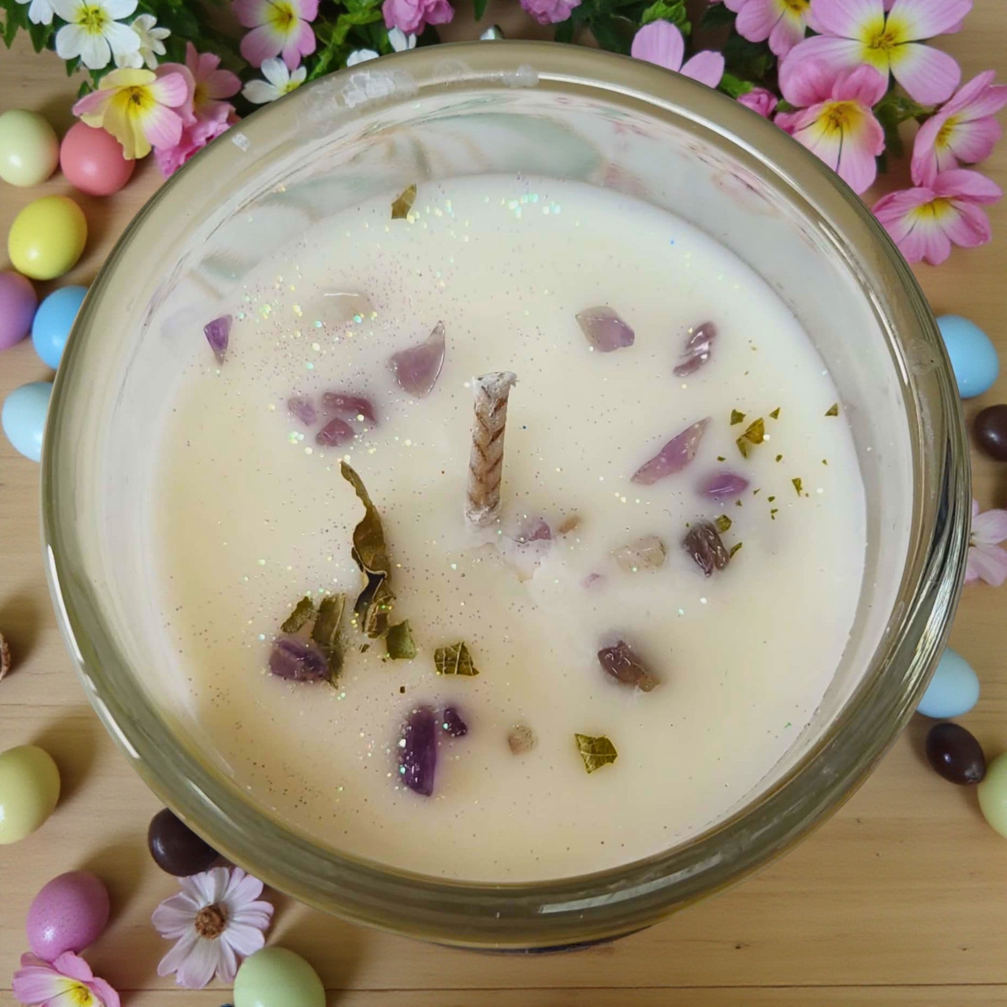 The Ostara candle is a soft violet / anise blend with vervain and amethyst chips on top.